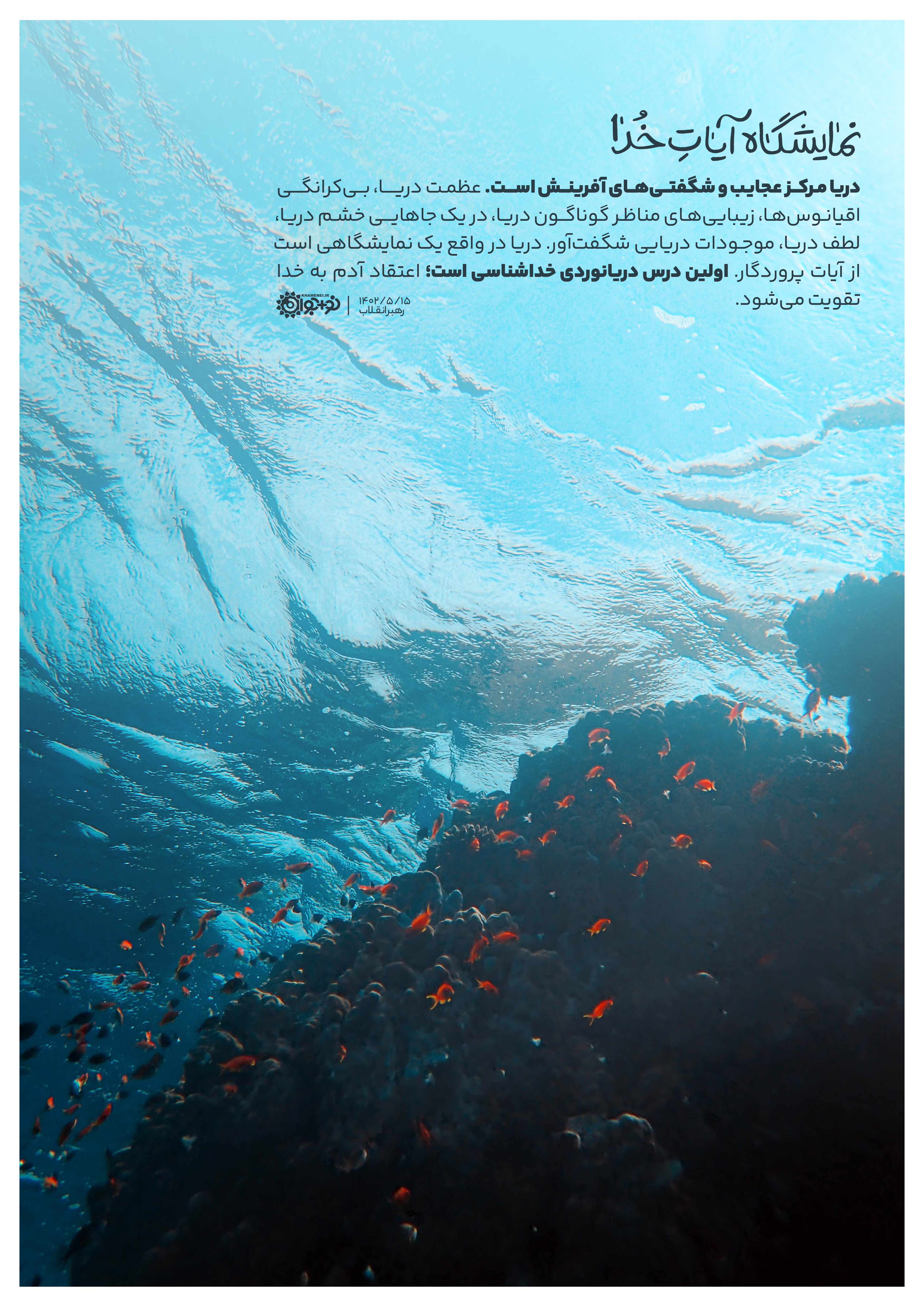 دریا مرکز عجایب و شگفتیهای آفرینش است. عظمت دریا، بیکرانگی اقیانوسها، زیباییهای مناظر گوناگون دریا، در یک جاهایی خشم دریا، لطف دریا، موجودات دریایی شگفتآور. دریا در واقع یک نمایشگاهی است از آیات پروردگار. اولین درس این دریانوردی خداشناسی است؛ اعتقاد آدم به خدا تقویت میشود.