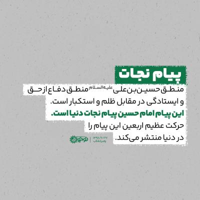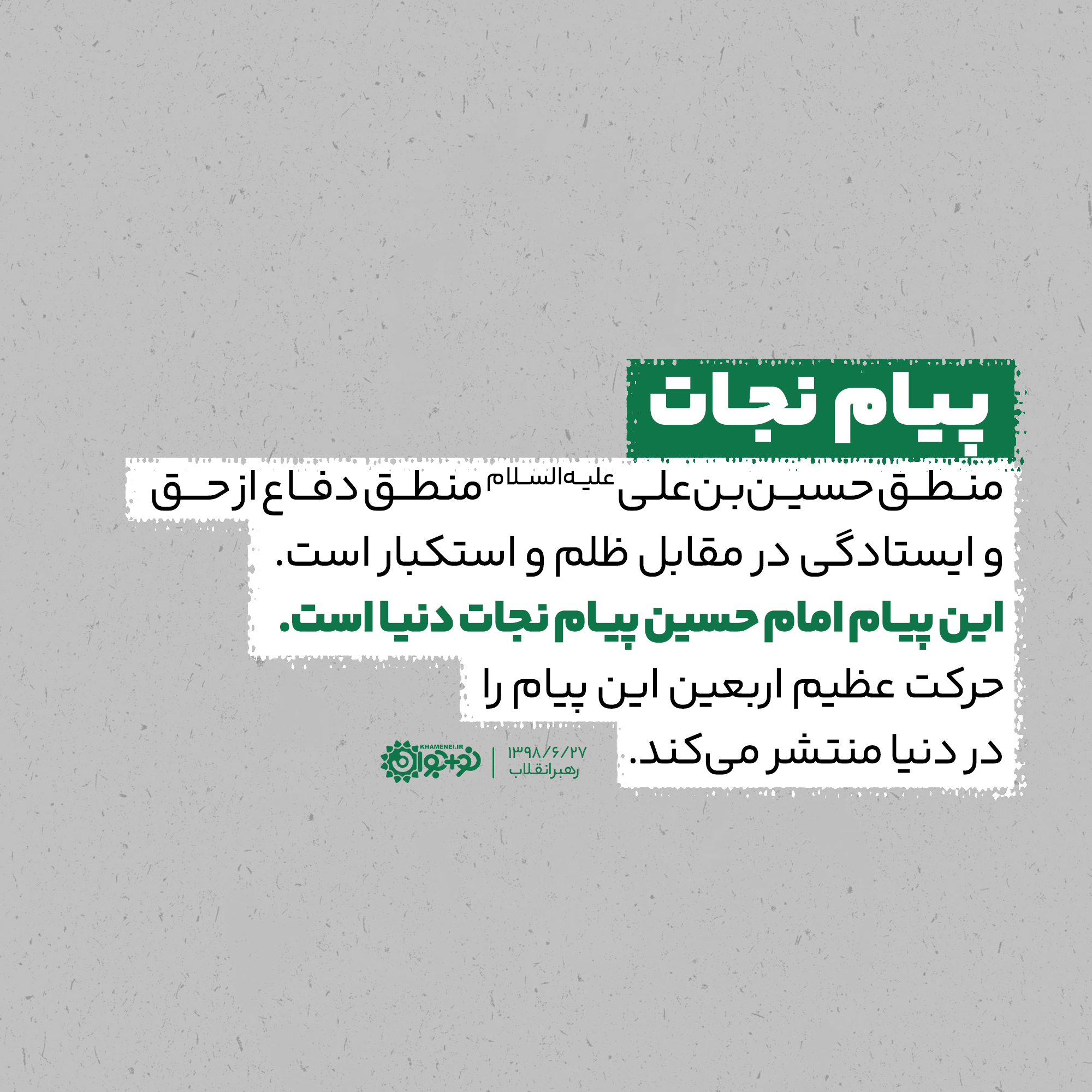 منطق حسینبنعلی علیهالسلام، منطق دفاع از حق و ایستادگی در مقابل ظلم و استکبار است. این پیام امام حسین پیام نجات دنیاست. حرکت عظیم اربعین این پیام را در دنیا منتشر میکند.