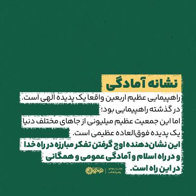 راهپیمایی عظیمِ اربعین واقعاً یک پدیده الهی است، یک پدیدهی معنوی است. در گذشته راهپیمایی بود، اما این جمعیتِ عظیمِ میلیونی از جاهای مختلف دنیا یک پدیده فوقالعاده عظیمی است. این نشاندهنده اوج گرفتن همین تفکر مبارزه در راه خدا و در راه اسلام و آمادگی عمومی و همگانی در این راه است.
