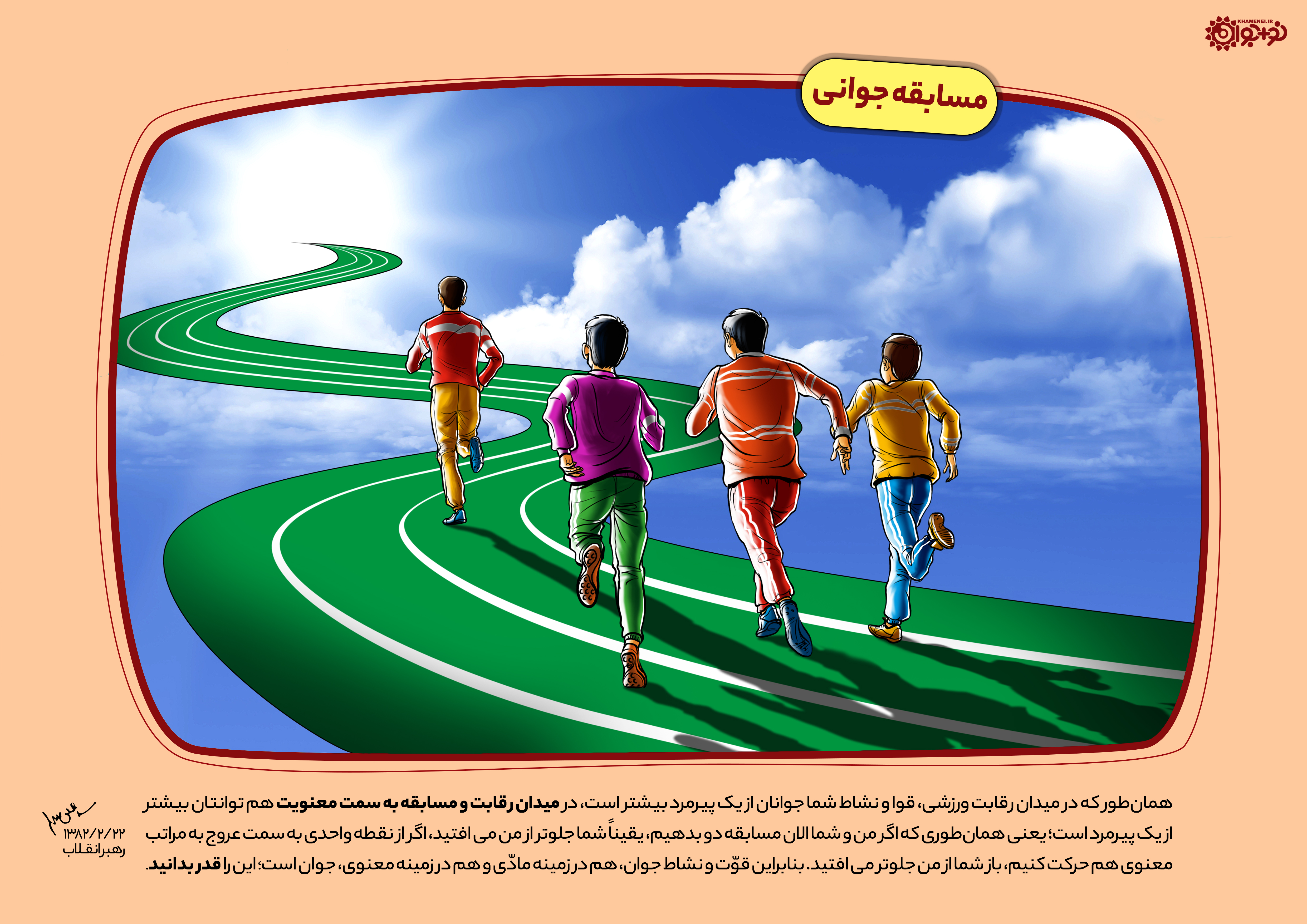 همانطور که در میدان رقابت ورزشی، قوا و نشاط شما جوانان از یک پیرمرد بیشتر است، در میدان رقابت و مسابقه به سمت معنویت هم توانتان بیشتر از یک پیرمرد است. یعنی همانطوری که اگر من و شما الآن مسابقه دو بدهیم، یقیناً شما جلوتر از من میافتید؛ اگر از نقطه واحدی به سمت عروج بهمراتب معنوی هم حرکت کنیم، باز شما از من جلوتر میافتید. بنابراین قوّت و نشاط جوان، هم در زمینه مادّی و هم در زمینه معنوی، جوان است. این را قدر بدانید.