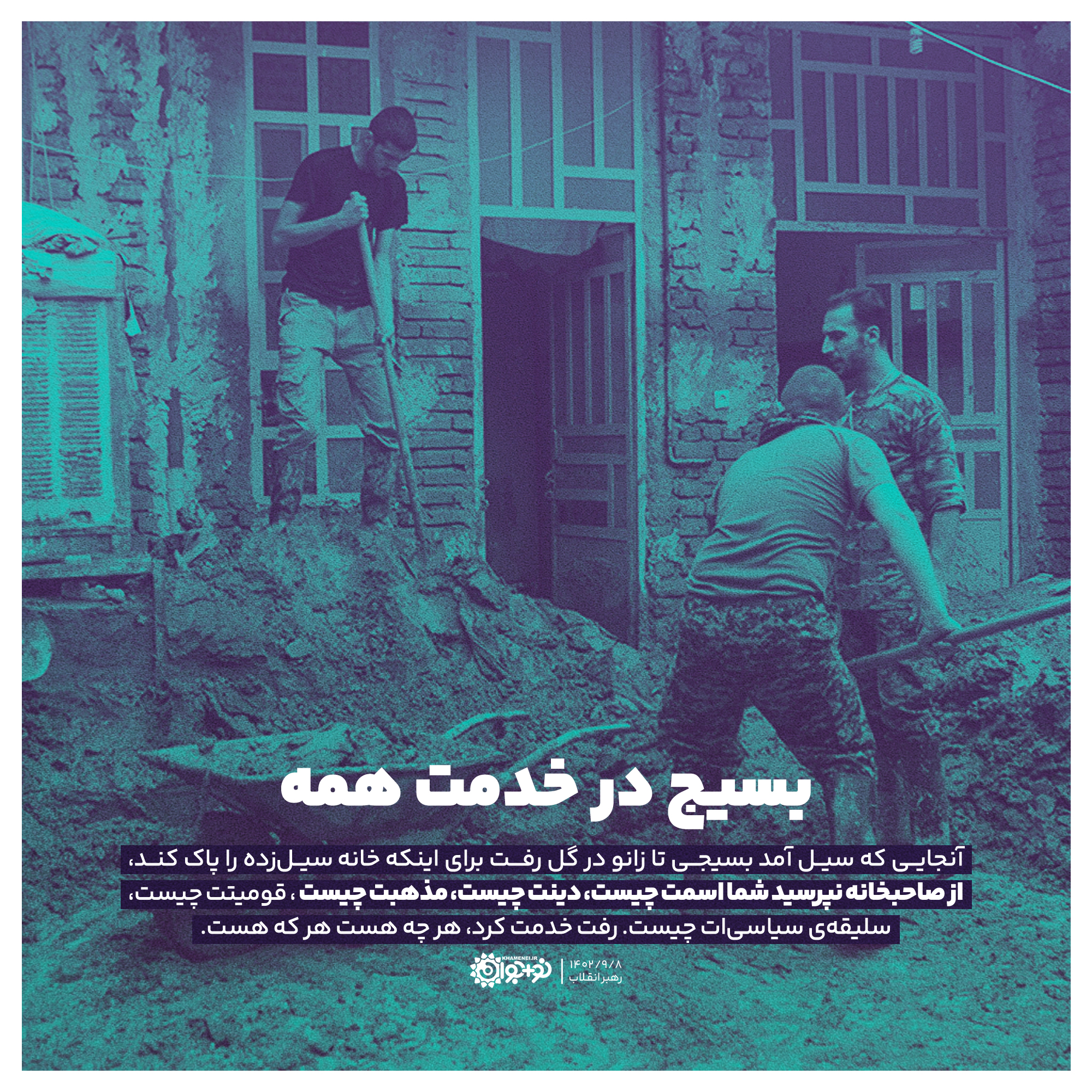 آنجایی که سیل آمد، بسیجی تا زانو داخل گِل رفت و برای اینکه خانه سیلزده را پاک کند، از صاحبخانه نپرسید شما اسمت چیست، دینت چیست، مذهبت چیست، قومیتت چیست، سلیقه سیاسیات چیست. رفت خدمت کرد. هر چه هست، هر که هست.
