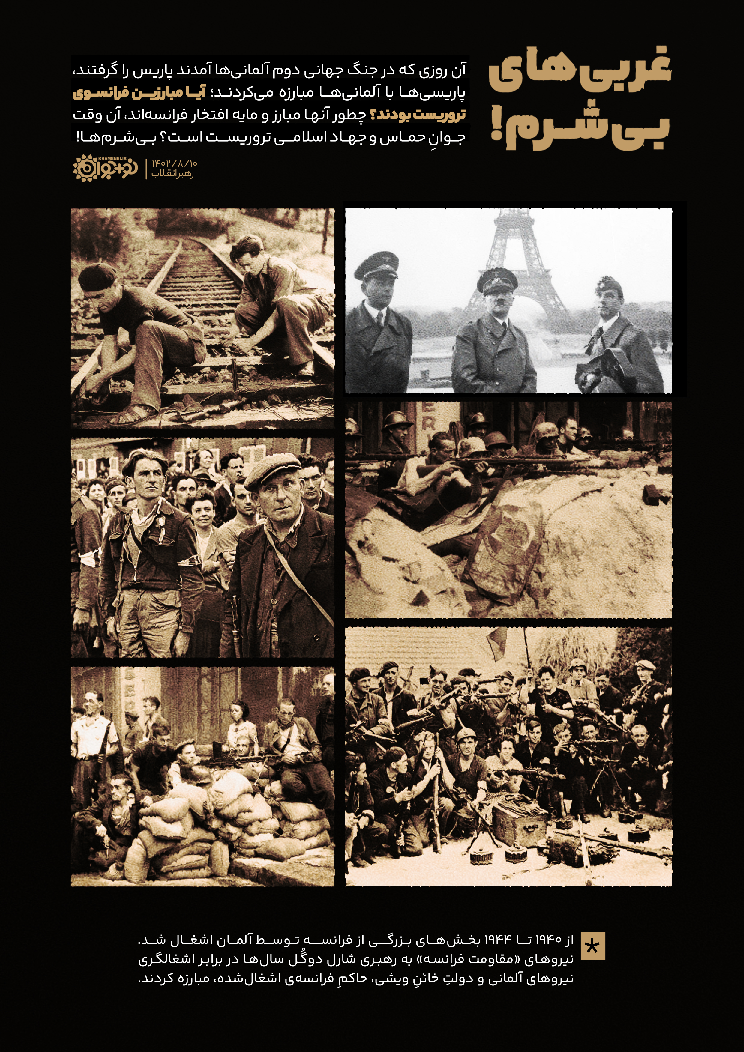 آن روزی که در جنگ جهانی دوم آلمانیها آمدند پاریس را گرفتند، پاریسیها با آلمانیها مبارزه میکردند، آیا مبارزین فرانسوی تروریست بودند؟ چطور آنها مبارز و مایه افتخار فرانسهاند، آنوقت جوان حماس و جهاد اسلامی تروریست است؟ بیشرمها!