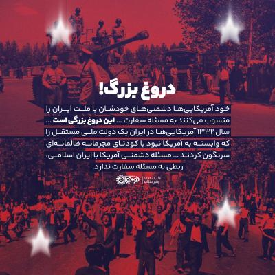 خود آمریکاییها دشمنیهای خودشان با ملت ایران را به مسئله سفارت منسوب میکنند ... این دروغ بزرگی است ... سال ۳۲، آمریکاییها در ایران یک دولت ملی مستقل را که وابسته به آمریکا نبود، با کودتای مجرمانه ظالمانهای سرنگون کردند ... مسئله دشمنی آمریکا با ایران اسلامی، ربطی به مسئله سفارت ندارد.