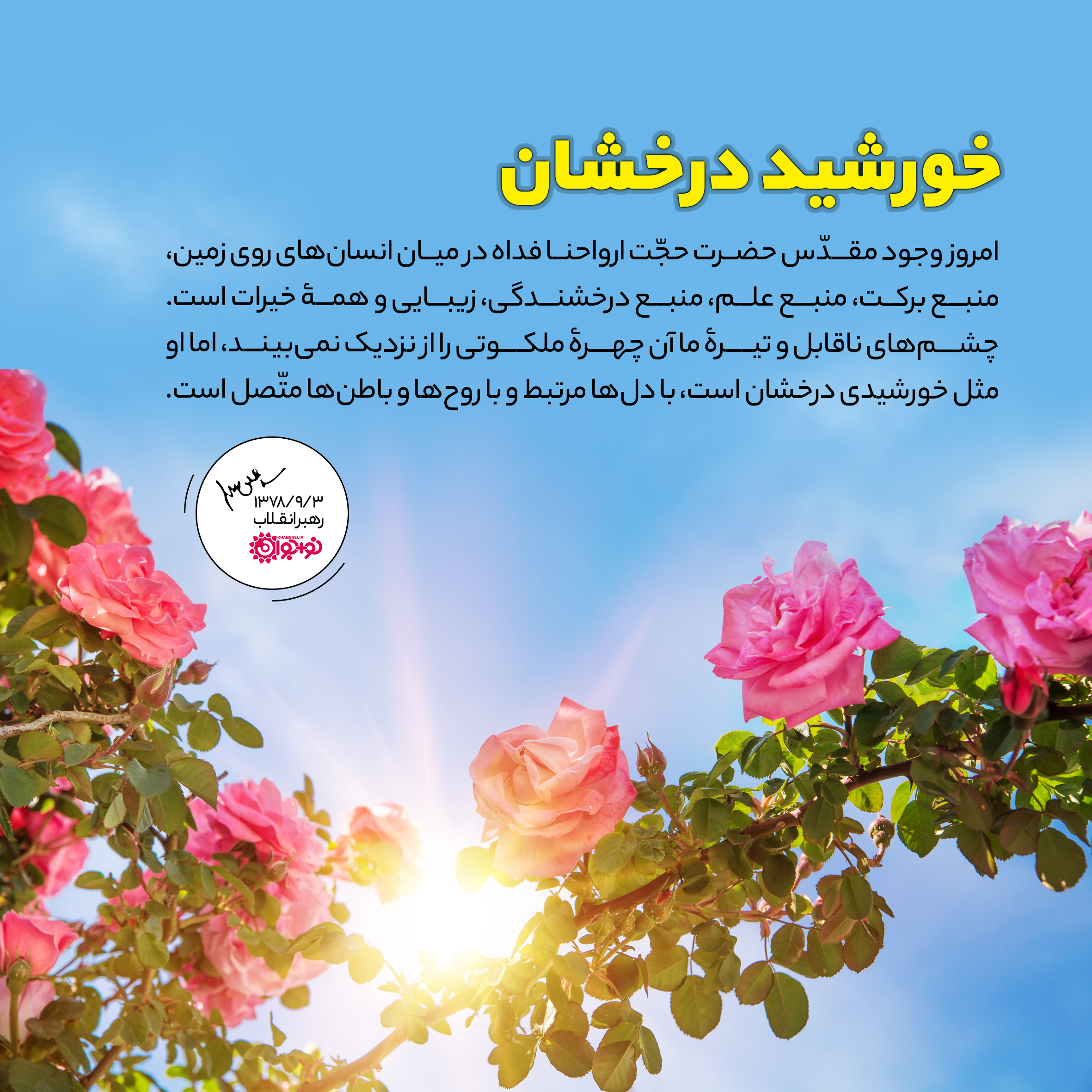امروز وجود مقدس حضرت حجت ارواحنافداه در میان انسانهای روی زمین، منبع برکت، منبع علم، منبع درخشندگی، زیبایی و همه خیرات است. چشمهای ناقابل و تیره ما آن چهره ملکوتی را از نزدیک نمیبیند؛ اما او مثل خورشیدی درخشان است، با دلها مرتبط و با روحها و باطنها متصل است.