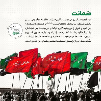 این راهپیمایی را میبینید؟ این حرکت عظیم میلیونی بین نجف و کربلا را، بین نجف و امام حسین علیهالسلام را مشاهده میکنید؟ این شور و شوق را میبینید؟ این حرکت را میبینید؟ این حرکت آنوقتی که لازم باشد با خطر همراه بشود، باز هم این شور و شوق در ملّت ما، در مردم ما، در جوانهای ما وجود دارد؛ این را باید نگه داشت، این آن چیزی است که ضامن بقای این کشور است.