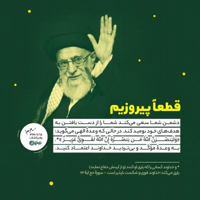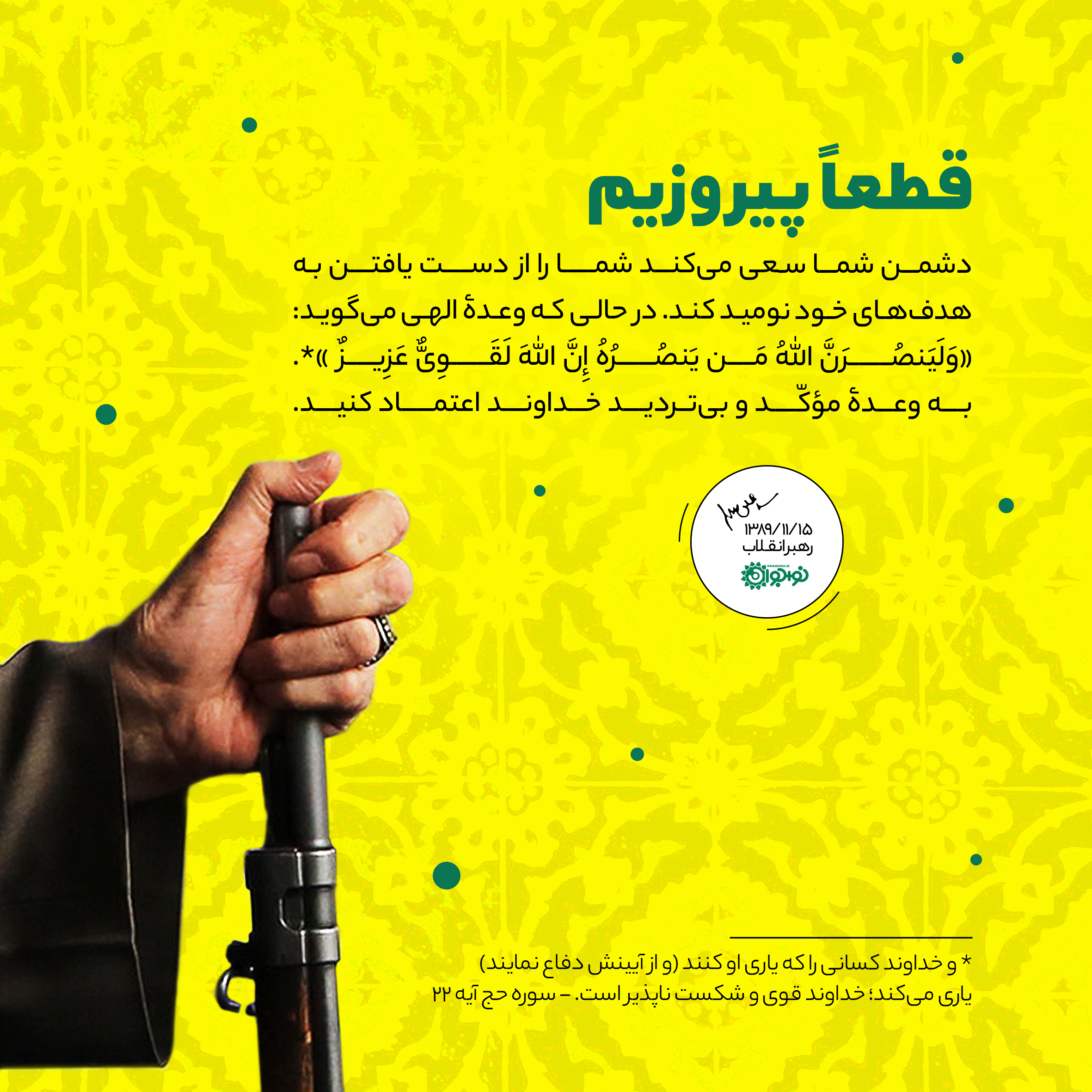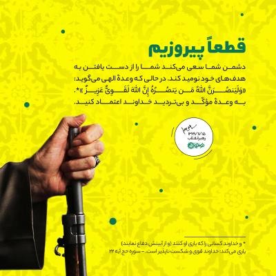دشمن شما سعی میکند شما را از دستیافتن به هدفهای خود نومید کند. در حالی که وعدهی الهی میگوید: «وَلَیَنصُرَنَّ اللَّهُ مَن یَنصُرُهُ إِنَّ اللَّهَ لَقَوِیٌّ عَزِیز»؛ به وعده مؤکد و بیتردید خداوند اعتماد کنید.