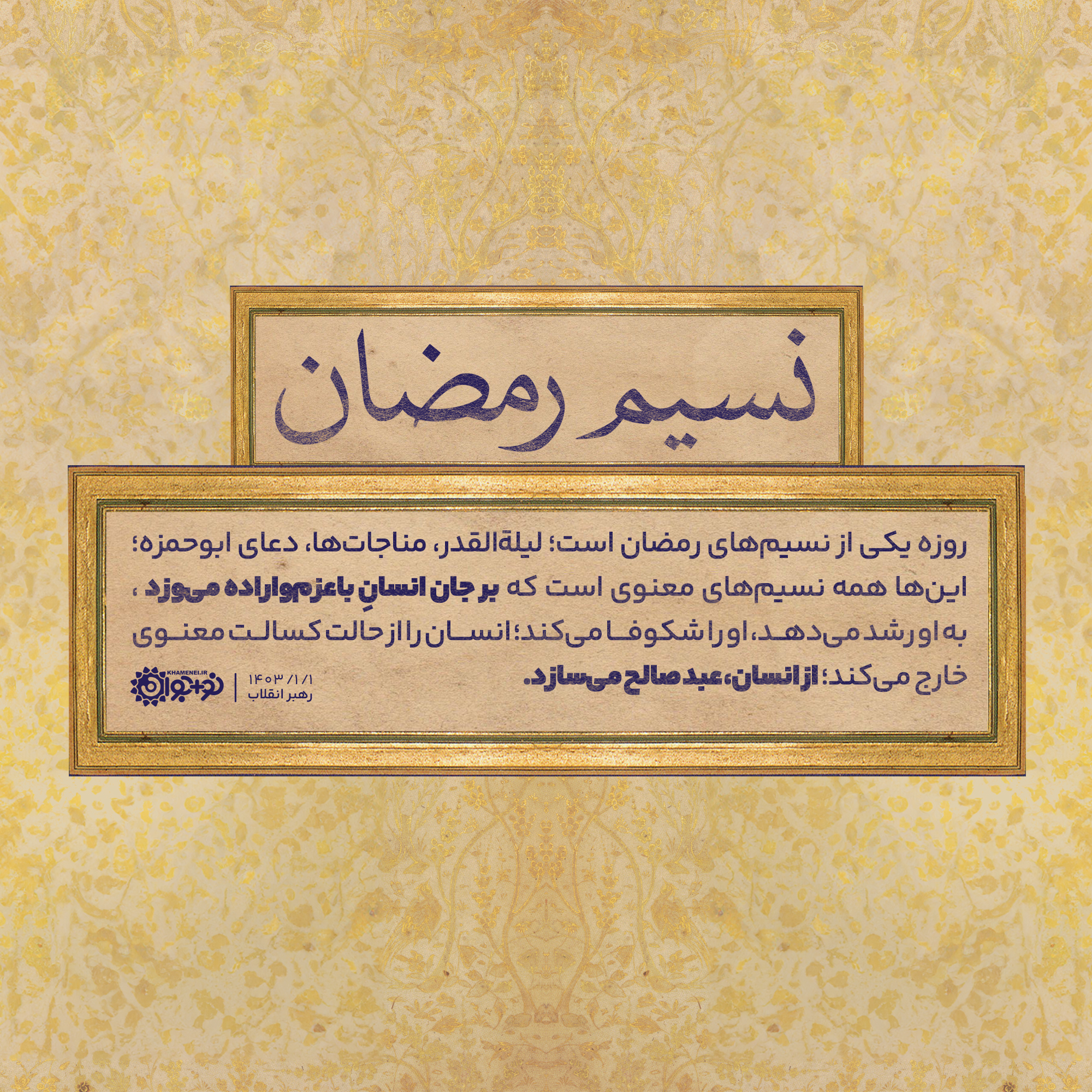 روزه یکی از نسیمهای رمضان است؛ لیلةالقدر، مناجاتها، دعای ابوحمزه؛ اینها همه نسیمهای معنوی است که بر جان انسانِ باعزمواراده میوَزد، به او رشد میدهد، او را شکوفا میکند؛ انسان را از حالت کسالت معنوی خارج میکند؛ از انسان، عبد صالح میسازد.