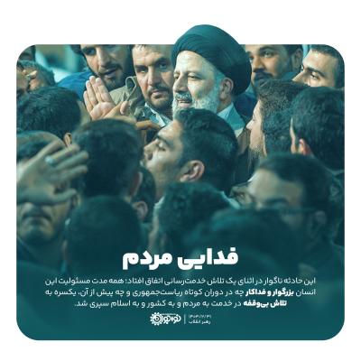 این حادثه ناگوار در اثنای یک تلاش خدمترسانی اتفاق افتاد؛ همه مدت مسئولیت این انسان بزرگوار و فداکار چه در دوران کوتاه ریاستجمهوری و چه پیش از آن، یکسره به تلاش بیوقفه در خدمت به مردم و به کشور و به اسلام سپری شد.