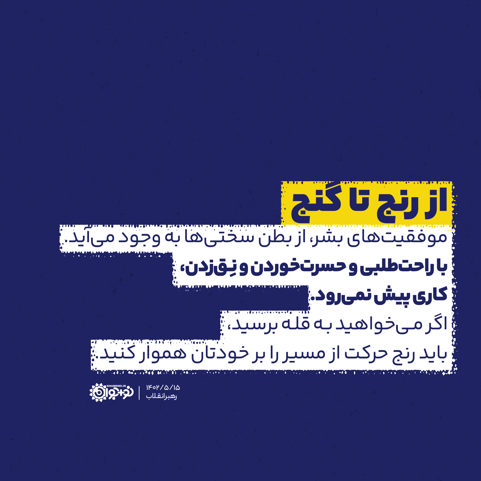 موفقیتهای بشر، از بطن سختیها بهوجود میآید. با راحتطلبی و حسرتخوردن و نِقزدن، کاری پیش نمیرود. اگر میخواهید به قله برسید، باید رنج حرکت از مسیر را بر خودتان هموار کنید.