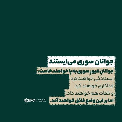 جوانان غیور سوری به پا خواهند خاست، ایستادگی خواهند کرد، فداکاری خواهند کرد و تلفات هم خواهند داد، اما بر این وضع فائق خواهند آمد.