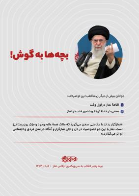 توصیه موکد اینجانب، اوّلاً اقامه نماز در اوّل وقت است و ثانیاً سعی در حفظ توجه و حضور قلب؛ نمازگزار بداند با مخاطبی سخن میگوید که مالک همه عالم وجود و ملِک روز رستاخیز است. نماز با این دو خصوصیت در دل و جان نمازگزار و آنگاه در عمل فردی و اجتماعی او اثر میگذارد.