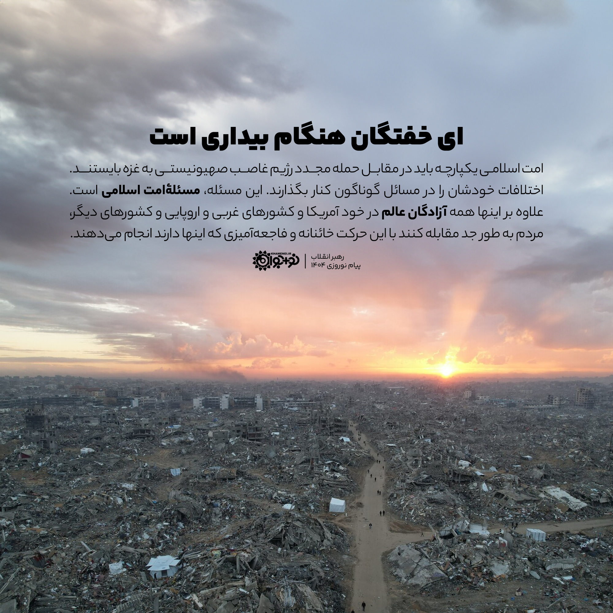 امت اسلامی یکپارچه باید در مقابل حمله مجدد رژیم غاصب صهیونیستی به غزه بِایستند. اختلافات خودشان در مسائل گوناگون را کنار بگذارند. این مسئله، مسئله امت اسلامی است. علاوهبر اینها همه آزادگان عالم، در خود آمریکا، در کشورهای غربی و اروپایی و کشورهای دیگر، مردم بهطور جد مقابله کنند با این حرکت خائنانه و فاجعهآمیزی که اینها دارند انجام میدهند.