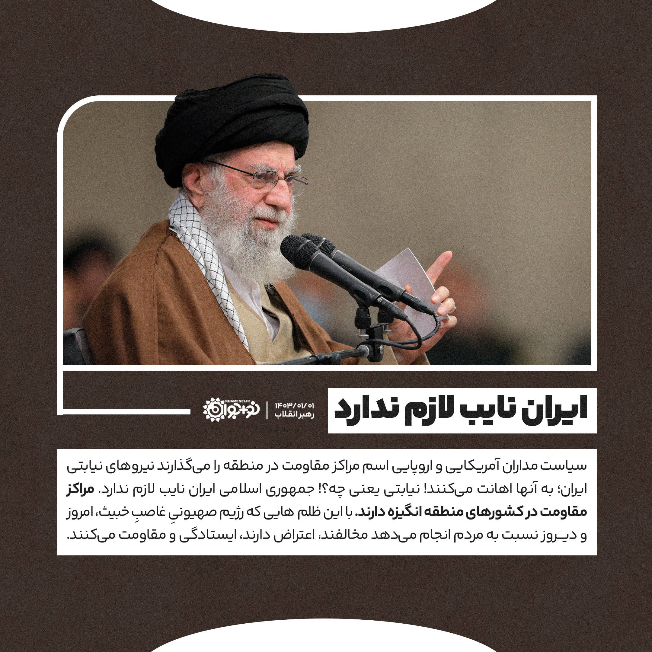 سیاستمداران آمریکایی و اروپایی اسم مراکز مقاومت در منطقه را میگذارند نیروهای نیابتی ایران؛ به آنها اهانت میکنند! نیابتی یعنی چه؟ جمهوری اسلامی ایران نایب لازم ندارد. مراکز مقاومت در کشورهای منطقه انگیزه دارند. با این ظلمهایی که رژیم صهیونیِ غاصبِ خبیث، امروز و دیروز نسبت به مردم انجام میدهد مخالفاند، اعتراض دارند، ایستادگی و مقاومت میکنند.