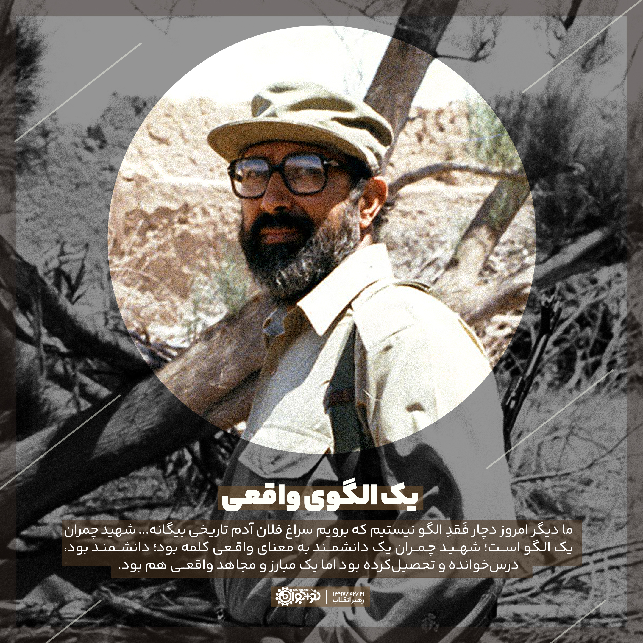 ما دیگر امروز دچار فَقدِ الگو نیستیم که برویم سراغ فلان آدم تاریخی بیگانه ... شهید چمران یک الگو است؛ شهید چمران یک دانشمند بهمعنای واقعی کلمه بود؛ دانشمند بود، درسخوانده و تحصیلکرده بود اما یک مبارز مجاهد واقعی هم بود،