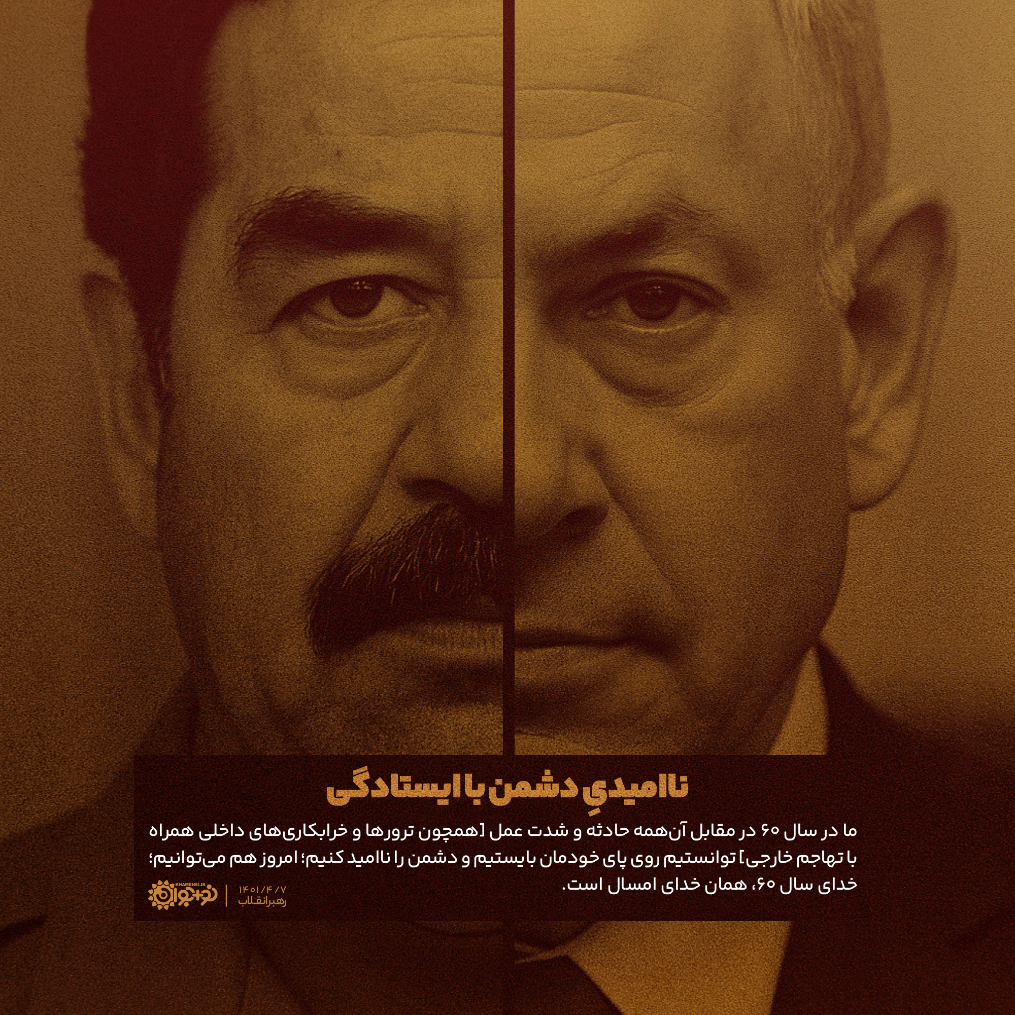 ما در سال ۶۰، در مقابل این همه حادثه و شدت عمل [همچون ترورها و خرابکاریهای داخلی همراه با تهاجم خارجی] توانستیم روی پای خودمان بِایستیم و دشمن را ناامید کنیم. امروز هم میتوانیم. خدای سال ۶۰، همان خدای امسال است