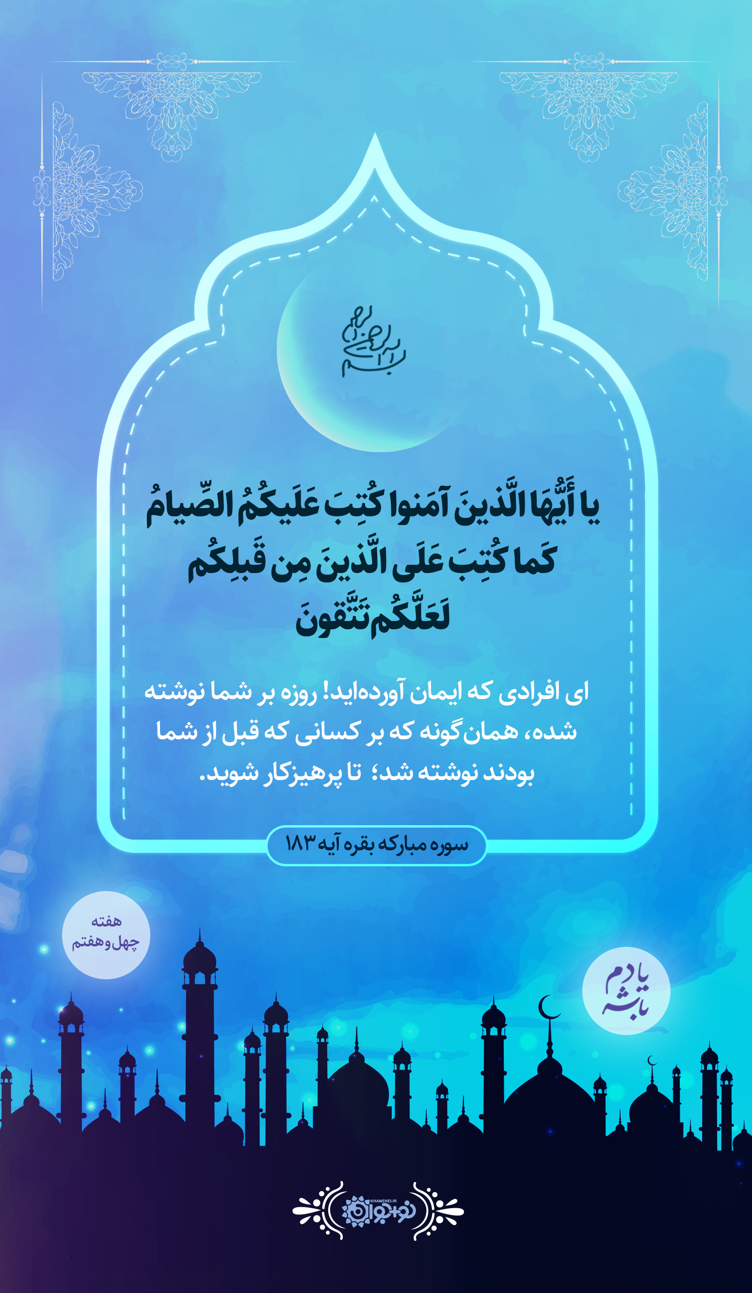 ای افرادی که ایمان آوردهاید! روزه بر شما نوشته شده، همانگونه که بر کسانی که قبل از شما بودند نوشته شد؛ تا پرهیزکار شوید.