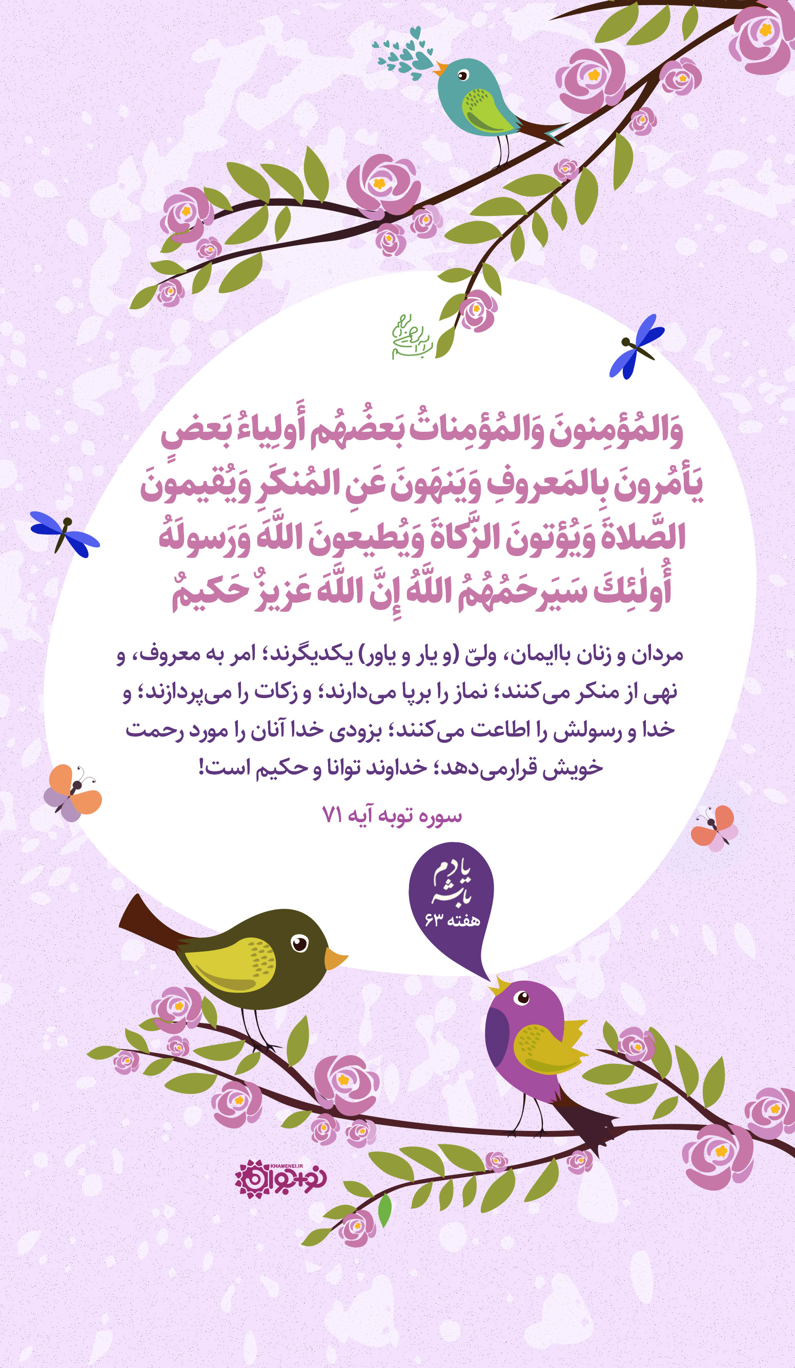 مردان و زنان باایمان، ولیّ (و یار و یاور) یکدیگرند؛ امر به معروف، و نهی از منکر میکنند؛ نماز را برپا میدارند؛ و زکات را میپردازند؛ و خدا و رسولش را اطاعت میکنند؛ بزودی خدا آنان را مورد رحمت خویش قرارمیدهد؛ خداوند توانا و حکیم است!