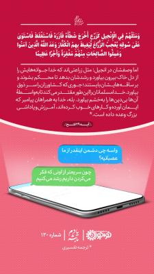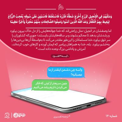 اما وصفشان در انجیل: مثل زراعتیاند که خدا جوانههایش را از دل خاک بیرون بیاورد و رشدشان بدهد تا محکم بشوند و بر ساقههایش بایستند؛ جوری که کشاورزان را سرِذوق بیاورد. خدا مسلمانان را این طور مقتدر میکند تا به واسطه آنها بیدینها را به خشم بیاورد. بله، خدا به همراهان پیامبر که ایمان آورده و کارهای خوب کردهاند، آمرزش و پاداشی بزرگ وعده داده است.*
