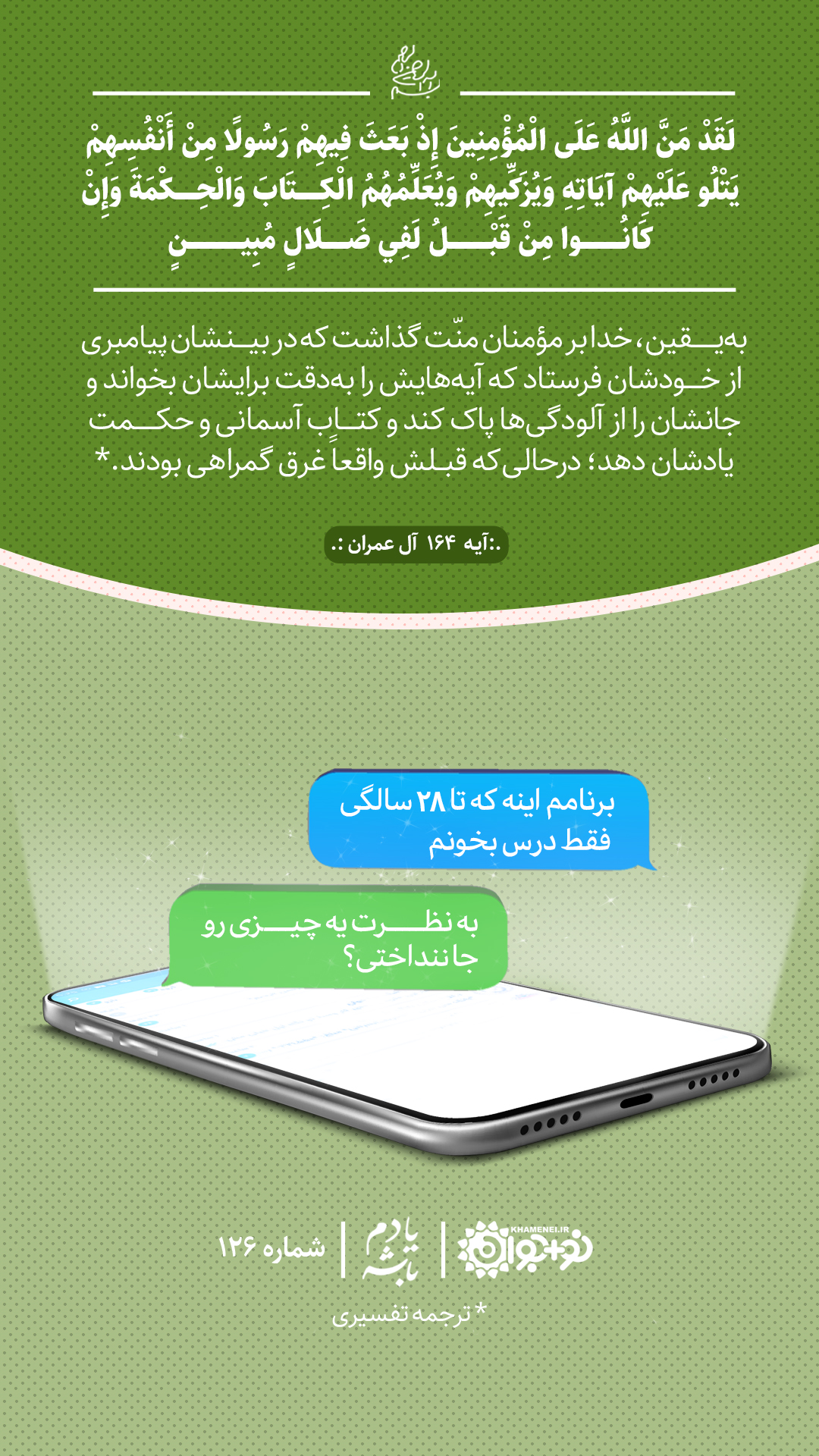 به یقین، خدا بر مومنان منّت گذاشت که در بینشان پیامبری از خودشان فرستاد که آیههایش را به دقت برایشان بخواند و جانشان را از آلودگیها پاک کند و کتاب آسمانی و حکمت یادشان دهد؛ در حالی که قبلش واقعاً غرق گمراهی بودند.*